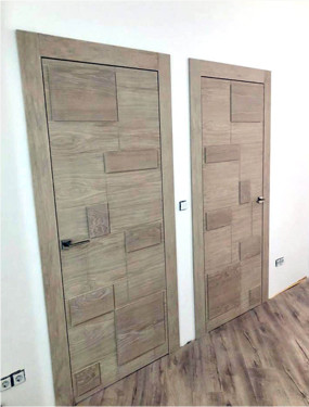- панели из древесины (МДФ, натуральное дерево): существенно увеличивает тепло- и шумоизоляцию, механическую прочность, придает естественность обычной двери.